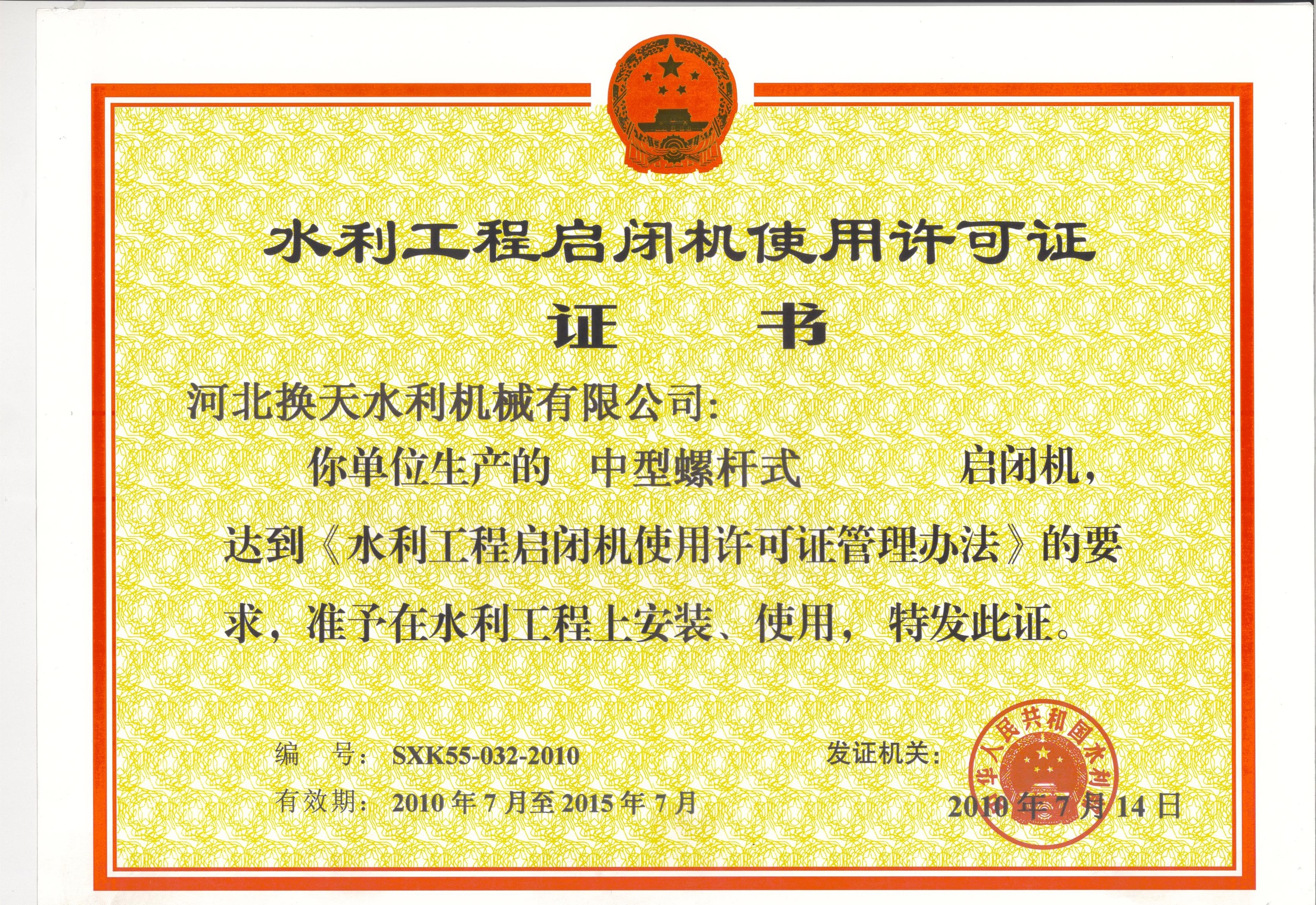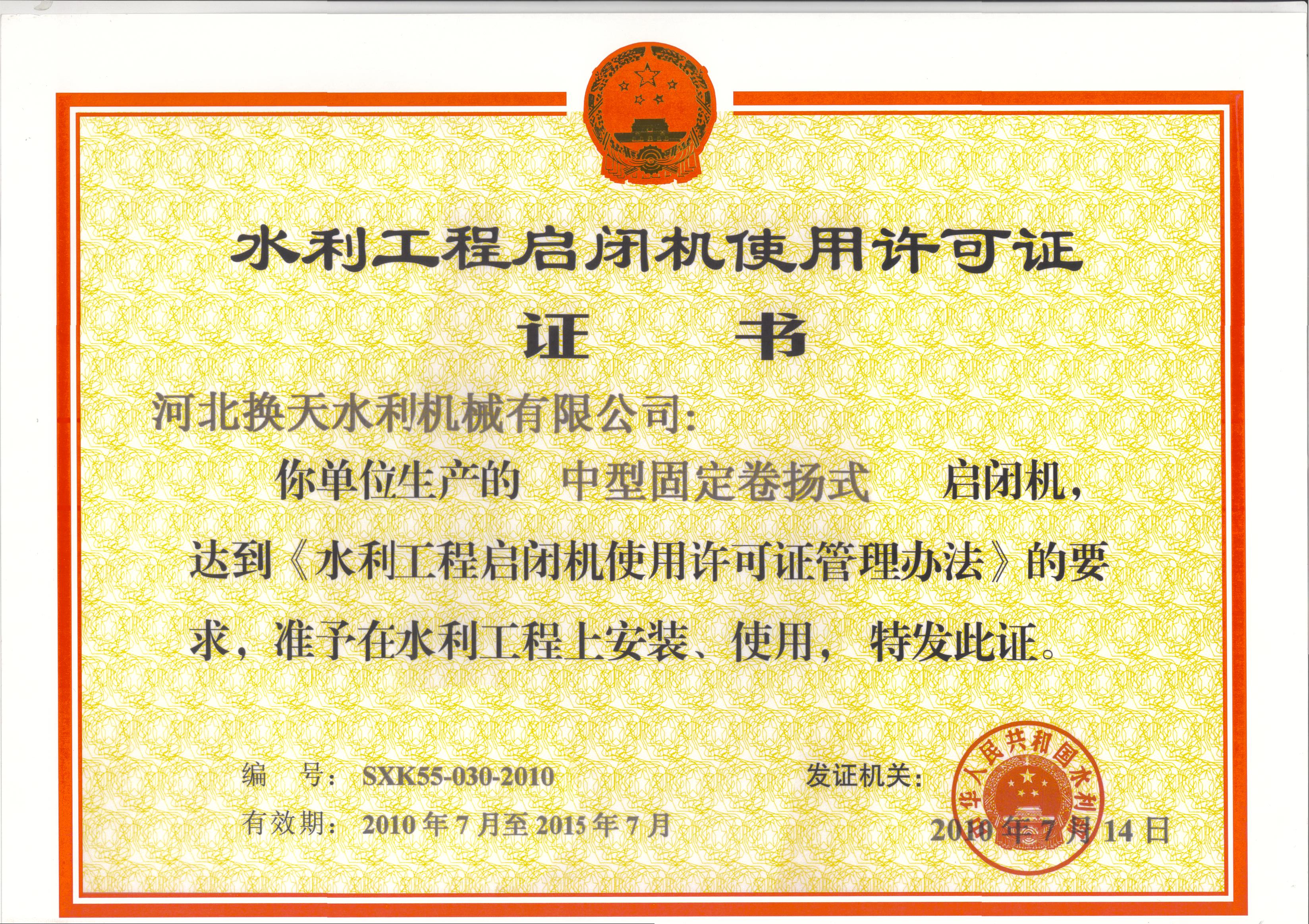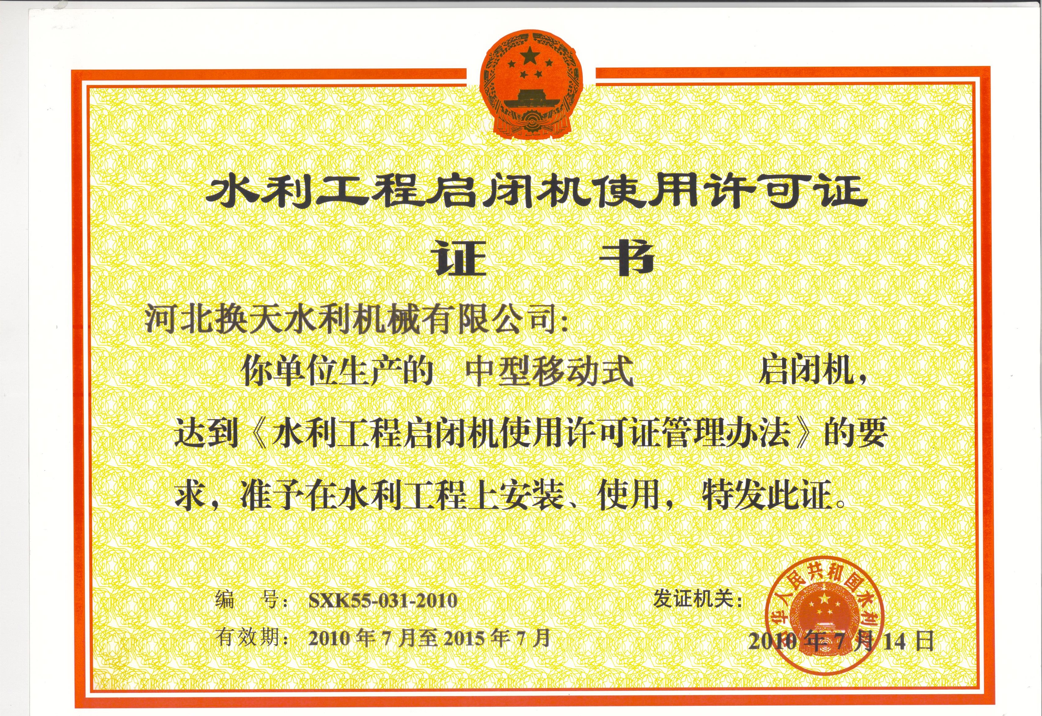 • 水利工程啟閉機使用許可證